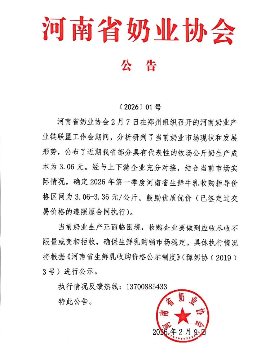河南省奶業(yè)協(xié)會2月7日在鄭州組織召開的河南奶業(yè)產(chǎn)業(yè)鏈聯(lián)盟工作會期間,分析研判了當前奶業(yè)市場現(xiàn)狀和發(fā)展形勢,公布了近期我省部分具有代表性的牧場公斤奶生產(chǎn)成本為3.06元。經(jīng)與上下游企業(yè)充分對接,結(jié)合當前市場實際情況,確定2026年第一季度河南省生鮮牛乳收購指導價格區(qū)間為3.06-3.36元/公斤。鼓勵優(yōu)質(zhì)優(yōu)價(已簽定過交易價格的遵照原合同執(zhí)行)。